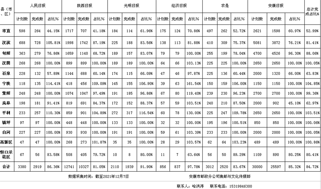 截至2021年12月7日,全市重點(diǎn)黨報(bào)黨刊完成量占下達(dá)計(jì)劃數(shù)的84.72%。征訂情況為:寧陜縣104.85%,平利縣103.51%,高新區(qū)100.86%,鎮(zhèn)坪縣100.06%,漢陰縣100.05%,白河縣100.05%,紫陽縣99.36%,旬陽市88.06%,漢濱區(qū)81.41%,恒口示范區(qū)80.41%,嵐皋縣62.97%,市直各單位52.99%。其中,寧陜縣、平利縣、高新區(qū)、鎮(zhèn)坪縣、漢陰縣、白河縣,措施有力,率先完成2022年度征訂任務(wù)。
