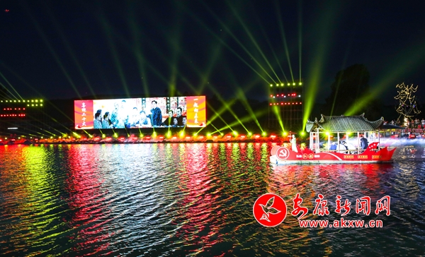晚會(huì)在嘹亮激昂的獨(dú)唱《東方紅》中拉開序幕,緊接著,磅礴大氣的歌舞串燒《我和我的祖國(guó)》《萬疆》《愛我中華》,如詩(shī)如畫的水上表演《南湖紅船》《江南水鄉(xiāng)》《滾滾長(zhǎng)江東逝水》,動(dòng)力澎湃的RAP時(shí)尚秀《門戶新安康》,美輪美奐歌舞表演《我的深情為你守候》《為祖國(guó)干杯》《送你一個(gè)長(zhǎng)安》《我愛你,中國(guó)》《領(lǐng)航》等節(jié)目相繼登臺(tái)表演,與此同時(shí),絢麗多彩的燈光秀和仙氣飄飄的霧森特效穿插其中,不斷將演出推向高潮。最后,整場(chǎng)演出在大合唱《沒有共產(chǎn)黨就沒有新中國(guó)》的歌聲中圓滿落下帷幕。