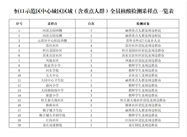 共設(shè)置20個(gè)采樣點(diǎn)、53個(gè)采樣臺(tái)(見附件),由相關(guān)責(zé)任單位統(tǒng)一負(fù)責(zé)采樣點(diǎn)設(shè)置、人員組織、秩序維護(hù),檢測對(duì)象按現(xiàn)場工作人員要求,有序到指定地點(diǎn)進(jìn)行采樣,避免人員聚集。