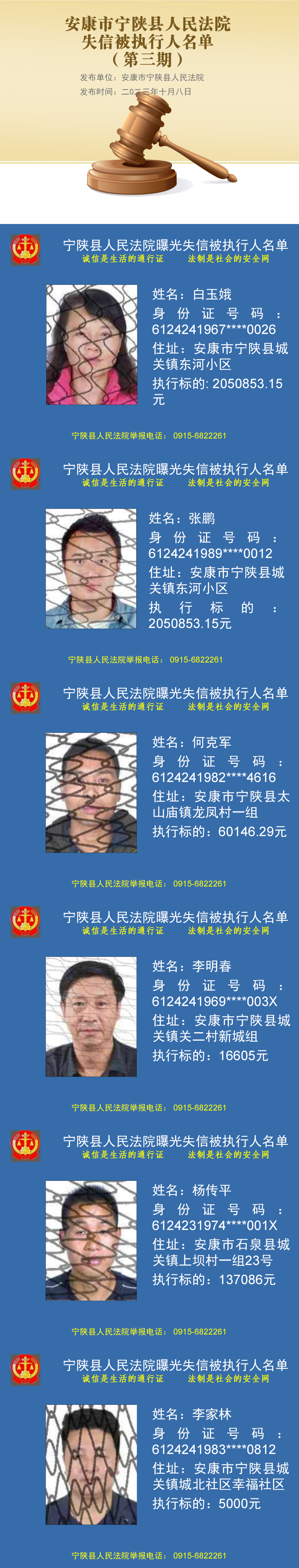 為維護(hù)司法權(quán)威,推動社會誠信體系建設(shè),促使被執(zhí)行人履行生效法律文書確定的義務(wù),根據(jù)《中華人民共和國民事訴訟法》第二百五十五條和《最高人民法院關(guān)于公布失信被執(zhí)行人名單信息的若干規(guī)定》的規(guī)定,被執(zhí)行人具有履行能力而不履行生效法律文書確定的義務(wù),人民法院應(yīng)當(dāng)將其納入失信被執(zhí)行人名單,依法對其進(jìn)行信用懲戒?,F(xiàn)將安康市寧陜縣人民法院2023年第三期失信被執(zhí)行人名單予以公布。