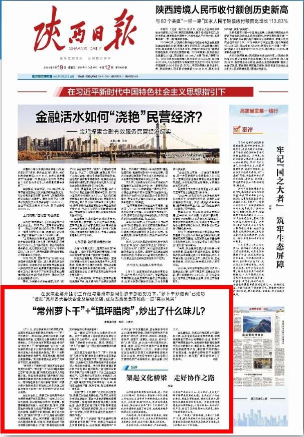 1月19日《陜西日報》頭版刊發(fā)文章《“常州蘿卜干”+“鎮(zhèn)坪臘肉”,炒出了什么味兒?》,報道鎮(zhèn)坪縣聯(lián)手常州市以文化賦能“土特產(chǎn)”,讓蘇陜協(xié)作更出彩!