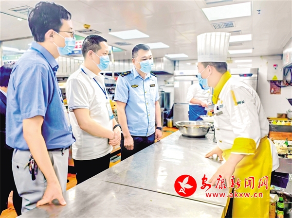 “五一”假日將至,漢濱區(qū)紀(jì)委監(jiān)委會(huì)同市場(chǎng)監(jiān)督管理部門對(duì)中心城區(qū)酒店餐飲服務(wù)場(chǎng)所開展監(jiān)督檢查。圖為檢查組在某酒店后廚了解情況。鄭時(shí)根 攝