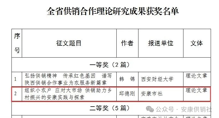 按:本文系安康市供銷合作社黨組書記、理事會主任邱德剛署名理論文章,立足供銷助力鄉(xiāng)村振興的安康實踐與探索,深入闡述了“組織小農(nóng)戶應(yīng)對大市場”的內(nèi)在邏輯,把群眾“組織起來”投身經(jīng)濟合作的實踐方法,在助力鄉(xiāng)村振興、推進共同富裕實踐中探索出一條可復(fù)制可推廣的典型經(jīng)驗,其理論內(nèi)涵、實踐邏輯為在推進鄉(xiāng)村振興中更好發(fā)揮供銷社的獨特優(yōu)勢和重要作用提供了有益參考,具有較強的指導(dǎo)意義。該文在中華全國供銷總社和陜西省供銷總社“薪火相傳七十載,砥礪奮進新時代”主題征文中獲評“全省供銷合作理論研究成果一等獎”。