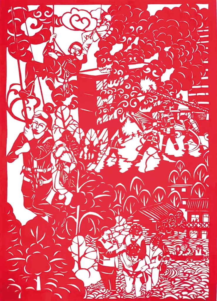 2022年,張莉的剪紙作品在“我與火焰藍”安康消防授旗訓(xùn)詞三周年風(fēng)采繪畫大賽中,榮獲“成人組優(yōu)秀作品獎”,并被主辦方收藏。2023年張莉帶隊參加“德潤安康”安康市首屆校園科技藝術(shù)節(jié),在剪紙區(qū),小隊員們發(fā)揮巧思妙想,精心設(shè)計、細心折剪,只見刀尖一開一合,紅紙不斷翻轉(zhuǎn),一幅幅栩栩如生、惟妙惟肖的作品就讓觀眾親眼見證了“刀光剪影”的神奇。隊員們嫻熟的技藝,精美的作品迅速吸引了許多人駐足參觀。