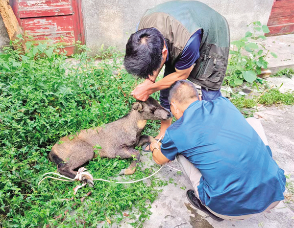 有著多次救助野生動(dòng)物經(jīng)驗(yàn)的八仙保護(hù)站站長(zhǎng)鄒奎兵,一邊安撫驚恐不安的野羊,一邊聯(lián)系當(dāng)?shù)孬F醫(yī)準(zhǔn)備救治。針劑急救,傷口處理,很快就緒,并臨時(shí)安置在千家坪林場(chǎng)廢棄的場(chǎng)院中。