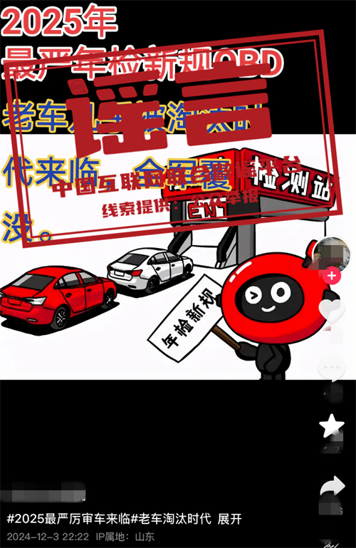 真相:近日,多個自媒體賬號發(fā)布消息,宣稱“史上最嚴車檢來了”“車檢年限變化”“燃油車年檢增加OBD檢測”等。中央廣電總臺中國之聲記者多方求證了解到,上述說法均為不實消息,目前各地車檢并沒有新變化。