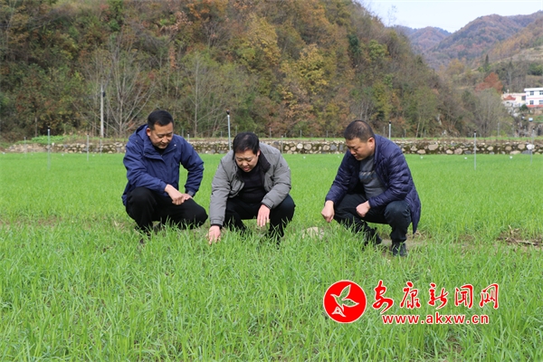 大河鎮(zhèn)先鋒社區(qū)第一書記馬鵬和市區(qū)農(nóng)技中心的專家在進(jìn)行冬小麥品種試驗(yàn)