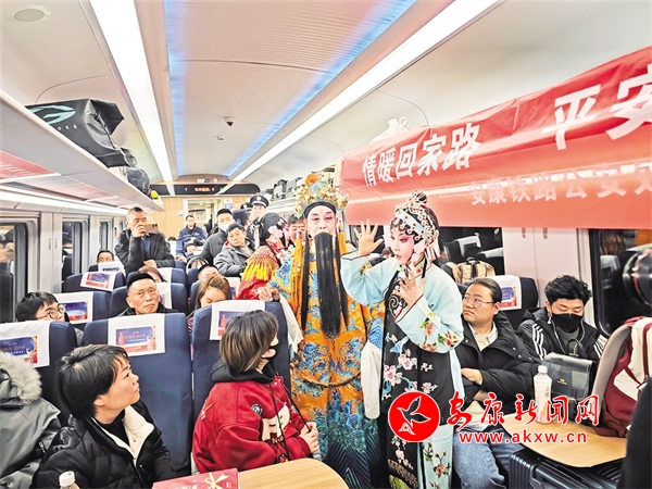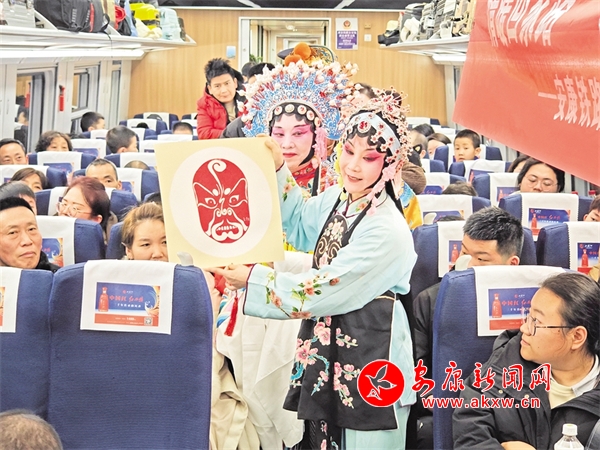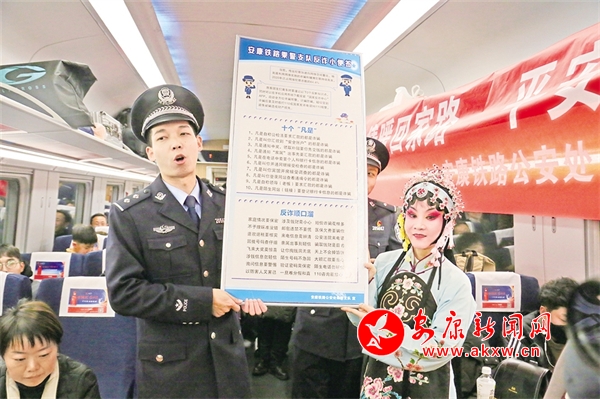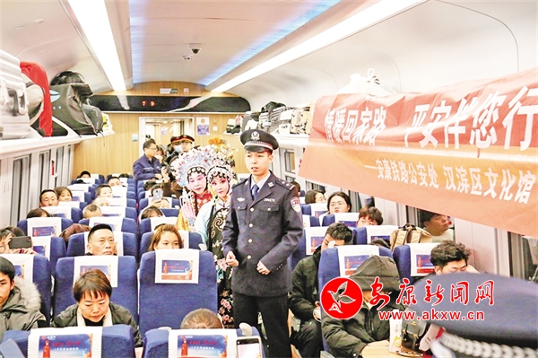 火車穿越秦巴山水間,途中,來自安康漢調二黃研究院的專業(yè)演員和地方民間漢調二黃愛好者們一同表演了國家級非物質文化遺產——漢調二黃經(jīng)典戲曲演唱,并為旅客們講解漢調二黃戲曲知識,與旅客們開展互動交流,讓旅客親身體驗漢調二黃戲服道具,感受漢調二黃的獨特藝術魅力。來自漢濱區(qū)文化館的漢濱剪紙技藝傳承人為旅客們展示講解了安康市級非物質文化遺產——漢濱剪紙技藝,向參與互動的旅客送上了親手創(chuàng)作的漢濱剪紙作品,提前送上新春祝福?;顒又校靼茶F路公安局安康公安處的民警們和文藝工作者們一同宣傳普及了反詐知識,進一步提升旅客的安全防范意識。