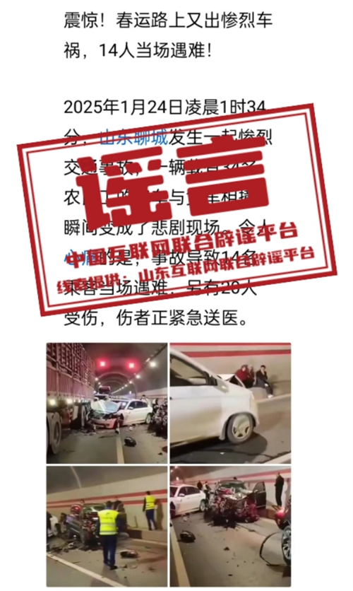 真相:近日,有網(wǎng)民在網(wǎng)絡平臺發(fā)布一則“山東聊城一隧道內(nèi)發(fā)生多車相撞”的信息,稱“現(xiàn)場多車發(fā)生嚴重碰撞,場面慘烈,群眾滯留”,引發(fā)關注。經(jīng)當?shù)鼐胶藢?,山東省聊城市從未發(fā)生過類似交通事故,該信息內(nèi)容純屬虛假編造。經(jīng)查,網(wǎng)民褚某某和韓某為博取關注、吸引流量,將外省市發(fā)生交通事故的圖片視頻移花接木,稱“聊城發(fā)生交通事故”并憑空捏造傷亡人數(shù),造成不良影響。目前,二人已被公安機關依法打擊處理。(來源:山東互聯(lián)網(wǎng)聯(lián)合辟謠平臺、聊城市網(wǎng)上辟謠平臺)