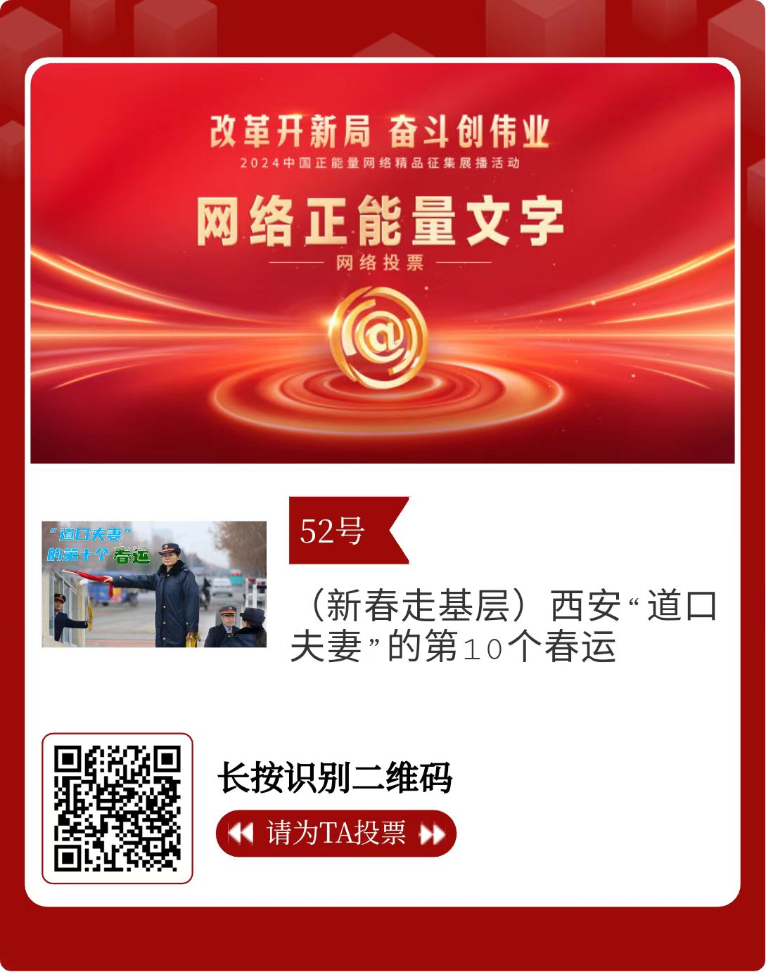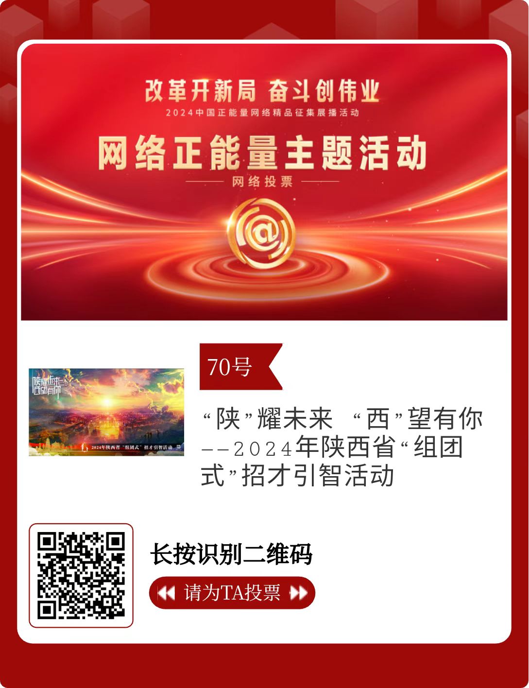陜西省32件作品進入投票環(huán)節(jié),投票時間為2月15日至2月21日,投票結(jié)果將作為中國正能量網(wǎng)絡(luò)精品遴選的重要參考。中國正能量網(wǎng)絡(luò)精品,期待每一個充滿正能量的你投出點贊一票。