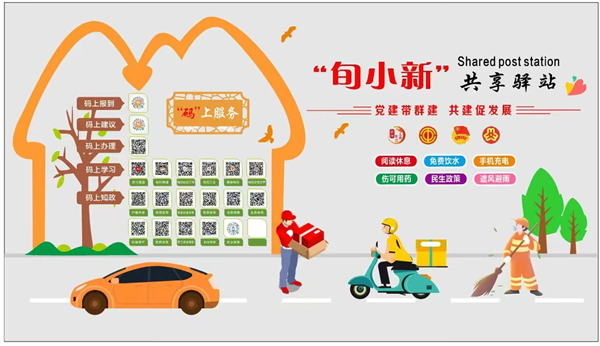 “旬小新”共享驛站按照“黨建帶群建 共建促發(fā)展”思路,秉持“需求前置、服務(wù)賦能”理念,通過整合行業(yè)部門、企業(yè)、社會三方資源,著力構(gòu)建“15分鐘暖新服務(wù)生態(tài)圈”,為快遞員、外賣騎手等新就業(yè)群體提供閱讀休息、免費(fèi)飲水、手機(jī)充電、應(yīng)急藥箱等18項(xiàng)基礎(chǔ)服務(wù)設(shè)施。