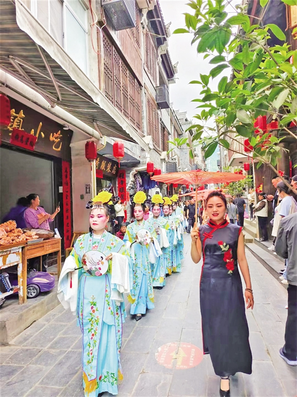 “過去總說‘捧著金飯碗要飯’,現(xiàn)在我們讓老手藝成了新飯碗?!惫沛?zhèn)“裕慶和”店面里,負責人李俊沏上一壺富硒茶,忍不住發(fā)出感嘆。這位扎根故鄉(xiāng)創(chuàng)業(yè)傳承非遺的“領頭雁”,將祖?zhèn)鞯陌舜蠹缦蛟斐闪裂勖K_發(fā)的“古鎮(zhèn)兩日游”線路,將美食體驗與民宿客棧、茶社書院有機結合,年接待游客上萬人次。