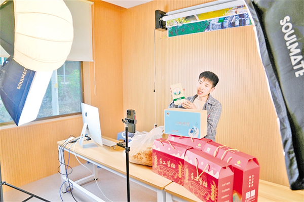 王幫樂(lè)在石門(mén)鎮(zhèn)電商直播基地銷(xiāo)售當(dāng)季的小溝茶葉