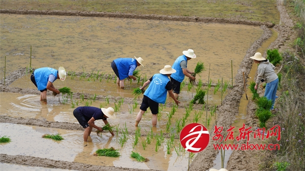 6月5日,走進城關(guān)鎮(zhèn)漁灣村麻莊組,一片熱火朝天的農(nóng)忙景象映入眼簾。農(nóng)技人員與農(nóng)戶們并肩作戰(zhàn),共同進行水稻插秧作業(yè)。劃線分區(qū)、精準(zhǔn)配肥、均勻撒肥、有序插秧……每一項工作都進行得有條不紊,大家分工明確、配合默契,田間地頭處處洋溢著忙碌而歡快的氣息。