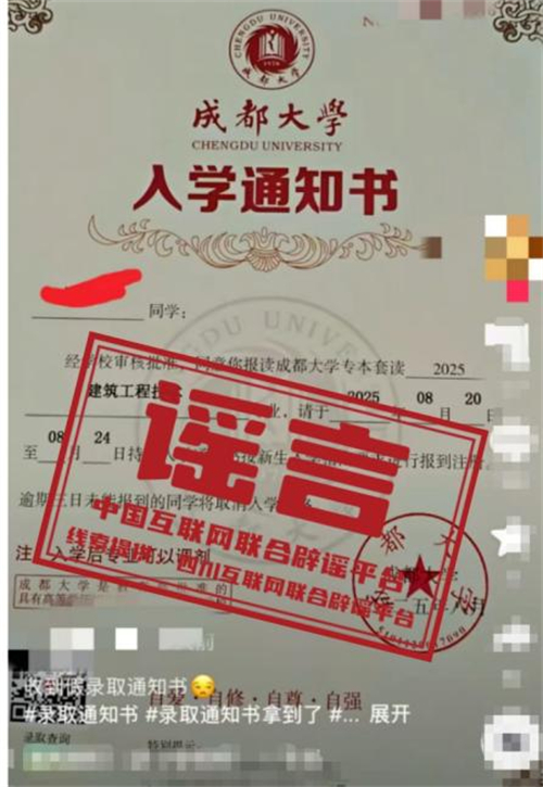 教育部多次提醒,部分機構和個人打著普通高等學歷教育幌子,實際卻為自考助學、網(wǎng)絡教育等其他教育形式,或進行虛假宣傳。如未通過高考招生錄取獲得正式通知書,無法注冊普通高校正式學籍,也無法取得普通高等學校學歷證書??忌凹议L應通過正規(guī)渠道核驗錄取信息,嚴格保護個人信息,防止被不法分子利用。(來源:四川互聯(lián)網(wǎng)舉報辟謠平臺、成都網(wǎng)絡辟謠)