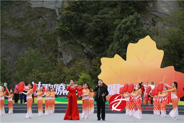 金秋時(shí)節(jié)的茨溝鎮(zhèn),萬畝紅葉、層林盡染。伴隨著歡快的鑼鼓聲,茨溝鎮(zhèn)、五里鎮(zhèn)、譚壩鎮(zhèn)三支隊(duì)伍輪番登場(chǎng),不僅獻(xiàn)唱原創(chuàng)村歌,還展示特色產(chǎn)業(yè)、優(yōu)質(zhì)資源與地方文化,紛紛亮出獨(dú)具特色的“看家絕活兒”。歌伴舞《村歌飛揚(yáng)》《松壩謠》《幸福歌兒唱起來》唱出了鄉(xiāng)親們的幸福生活;以修建八一水庫為背景的安康歌謠《我來了》引發(fā)會(huì)場(chǎng)共鳴;民俗表演《龍的傳人》則將節(jié)目推向高潮。舞蹈、鄉(xiāng)村T臺(tái)秀、民俗表演、八岔戲等節(jié)目,或以傳統(tǒng)幽默詼諧的風(fēng)格,或以深情敘述的方式,展現(xiàn)鄉(xiāng)村新生活,為觀眾獻(xiàn)上一場(chǎng)別開生面的視聽盛宴,現(xiàn)場(chǎng)歡呼聲此起彼伏。