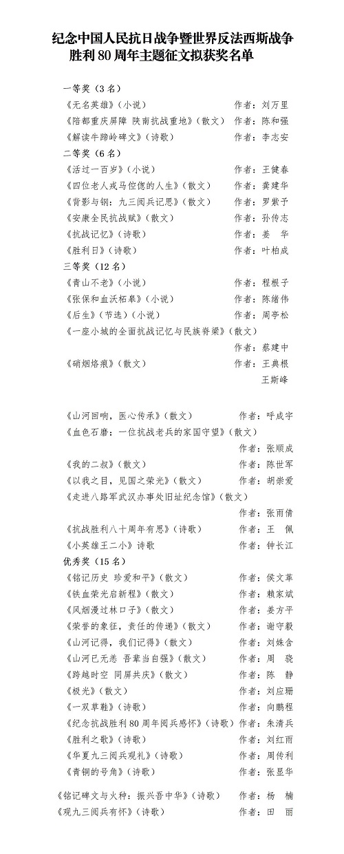 紀(jì)念中國人民抗日戰(zhàn)爭暨世界反法西斯戰(zhàn)爭勝利80周年主題征文評審結(jié)果公示