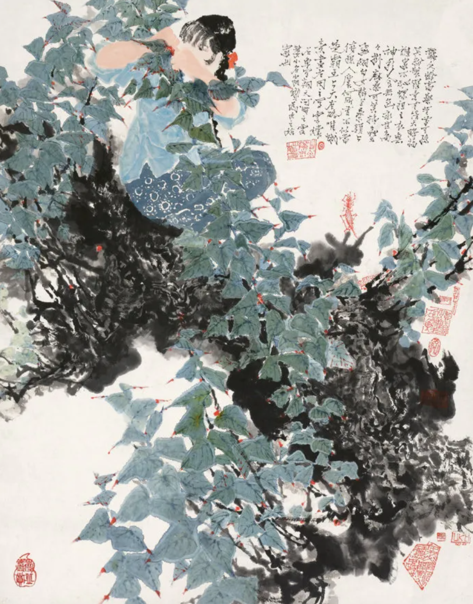 題識(shí):蠶女齡喬桑,昔有王孫笑粉妝。羅素有情天降福,誰家不秘王祖。衣無神采食無魚,永世商裔掛麻桑??尚γ尴x無飛翅,白女敢上桑顛上。俯視人寰何所有,不似當(dāng)(年)楚霸王。上天有路唯蛾素,畫者因之寫云。石魯寫朝天河畔之云婆,小名安蛾,為女之姑家也。《采桑圖》,2010春拍成交價(jià)1064萬元。