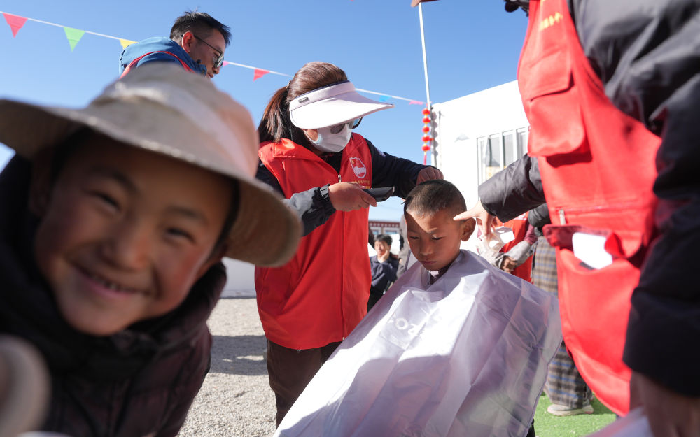 ??2025年1月26日,志愿者在西藏拉孜縣吉如村安置點為孩子們理發(fā)。西藏定日縣6.8級地震發(fā)生后,志愿者們迅速參與救援搜救、協(xié)助搭建帳篷、搬運(yùn)賑濟(jì)物資、協(xié)調(diào)村民所需。數(shù)百名大學(xué)生組成志愿者服務(wù)隊,白天為安置點的孩子們輔導(dǎo)作業(yè)、陪孩子們運(yùn)動;晚上組成巡邏隊,守護(hù)安置點的安寧。