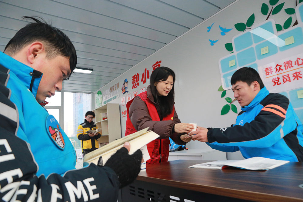 ??2023年12月27日,志愿者在山東省高密市密水街道“憩小亭”服務(wù)站為外賣騎手送上熱水。入冬以來,山東省高密市密水街道推進(jìn)“憩小亭”暖心服務(wù)站建設(shè),為外賣騎手、快遞小哥、網(wǎng)約車司機(jī)、環(huán)衛(wèi)工人等戶外勞動者提供飲水、無線上網(wǎng)、食物加熱等多項服務(wù),讓他們感受到冬日里的溫暖。