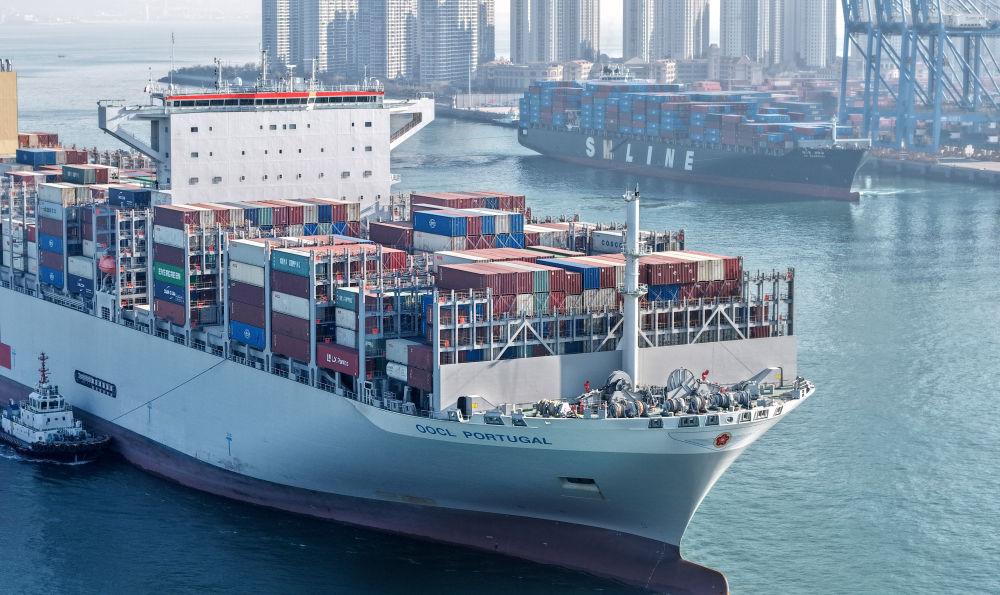 2025年12月4日,貨輪進(jìn)出山東港口青島港前灣港區(qū)(無人機(jī)照片)。新華社記者 李紫恒 攝