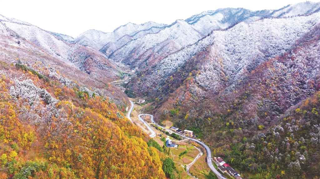車(chē)子繼續(xù)向前,離寧陜?cè)絹?lái)越近時(shí),車(chē)窗外那片銀裝素裹的童話(huà)世界竟悄悄退場(chǎng),再次將五彩斑斕鋪展開(kāi)來(lái)。楓紅未減,葉黃依舊,深綠的枝葉間還凝著點(diǎn)點(diǎn)雪色,像是剛從時(shí)光隧道走出一般。陽(yáng)光不知何時(shí)鉆出了云層,照在未化的雪上,泛起細(xì)碎的晶瑩。這時(shí)的山野,既有秋的飽滿(mǎn),又有冬的清澈,仿佛一場(chǎng)盛大的交接正在無(wú)聲進(jìn)行,秋不忍盡褪其色,冬亦不忍驟掩其華,于是二者相融,成就了這短暫而珍貴的相遇。