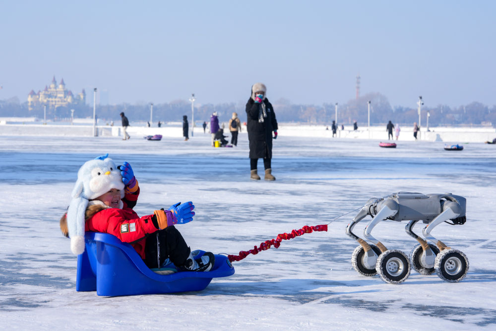 ?? 1月11日,小朋友在松花江哈爾濱段江面上體驗機器狗拉爬犁。新華社記者 王建威 攝