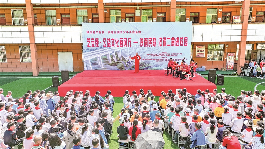 線上課程補(bǔ)足了師資缺口,線下的實(shí)踐體驗(yàn)與成果展示則進(jìn)一步鞏固了美育成效。該館全年開展版畫、民歌、剪紙等專項(xiàng)培訓(xùn)48場,服務(wù)青少年8000余人次;舉辦“兒童版畫走基層”展覽12場,培訓(xùn)學(xué)生1200余人,24件學(xué)生作品入選全國少兒版畫雙年展;開展“非遺進(jìn)校園”陜南民歌、漢調(diào)二黃等展演培訓(xùn)30余場,成立非遺社團(tuán)10個,發(fā)展學(xué)員400余人。在漢調(diào)二黃進(jìn)校園活動中,安康中學(xué)教育集團(tuán)初中部的學(xué)生們身著傳統(tǒng)戲服,演繹《太君辭朝》選段,一招一式有板有眼,韻味十足。“為了排好這個節(jié)目,同學(xué)們利用課余時間刻苦訓(xùn)練了3個月?!敝笇?dǎo)老師許世蓮說,通過學(xué)習(xí)戲曲,學(xué)生們不僅提升了藝術(shù)素養(yǎng),更領(lǐng)悟到了其中蘊(yùn)含的家國情懷和民族精神。