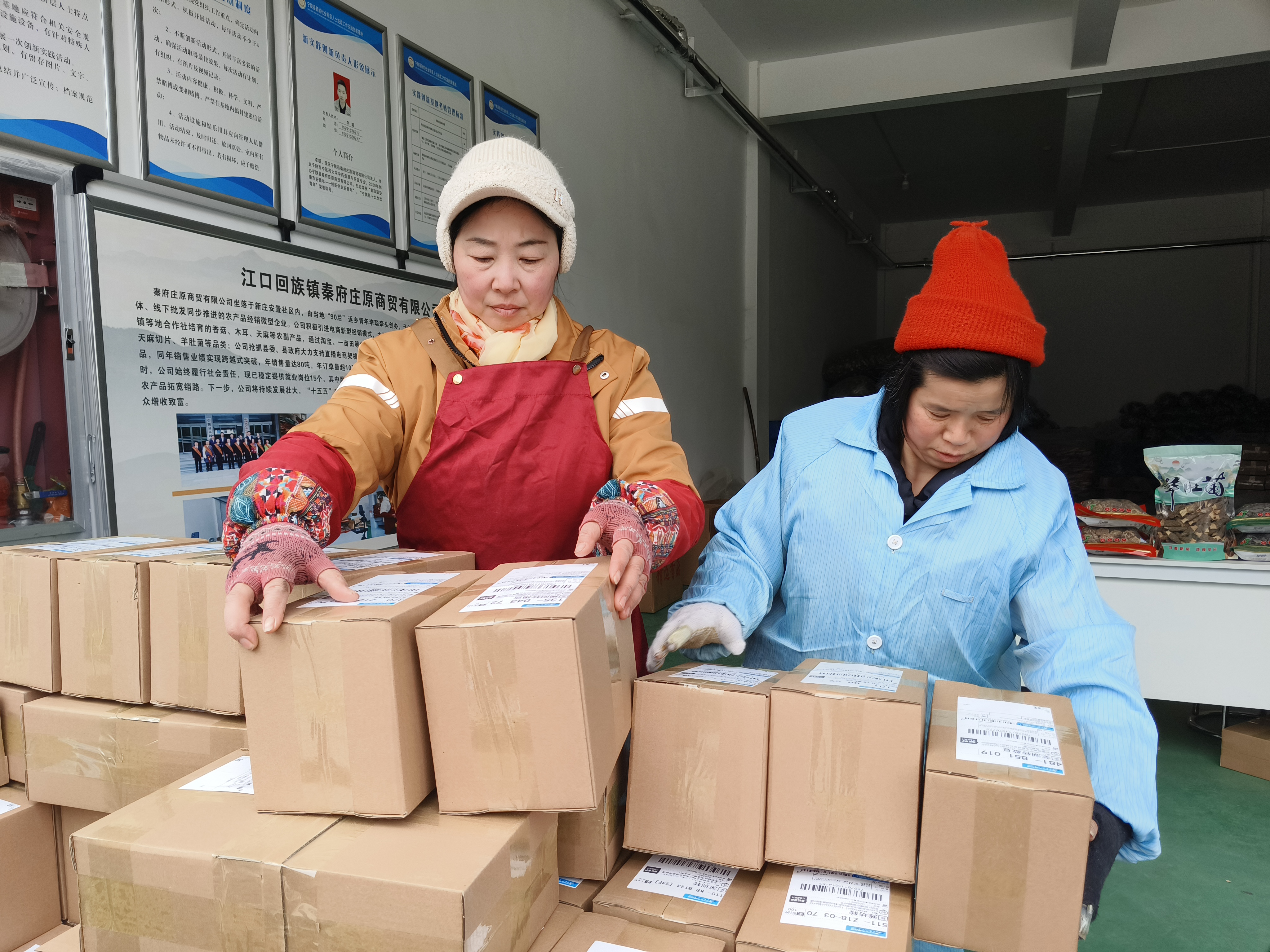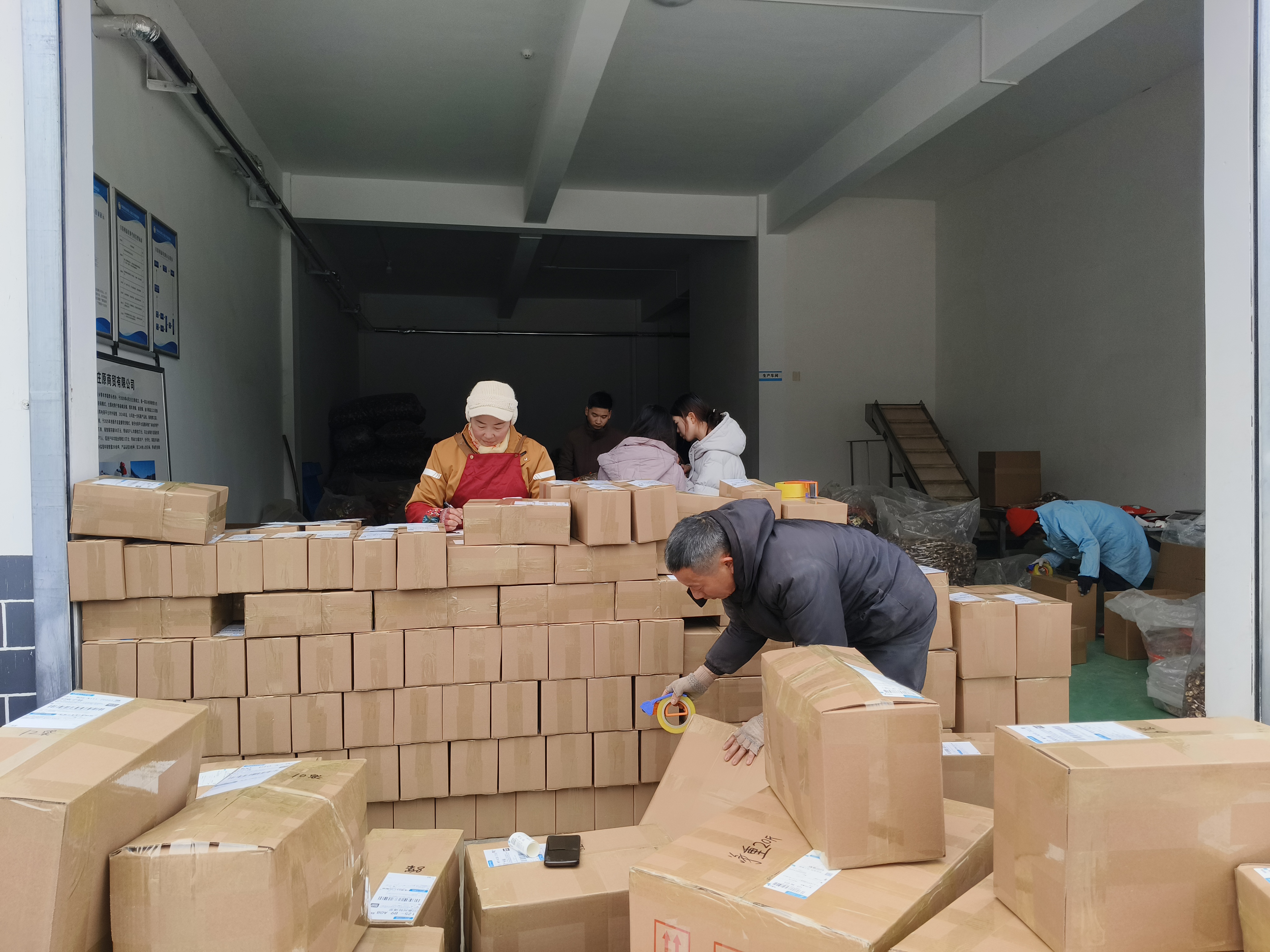 春節(jié)前夕,寧陜縣江口回族鎮(zhèn)秦府莊原商貿(mào)有限公司內(nèi)一片繁忙,工人們忙著打包、發(fā)貨。近期,寧陜山珍線上銷量持續(xù)走高,日均發(fā)貨約700單。(劉長(zhǎng)兵 攝)