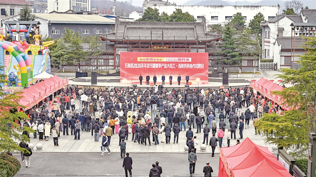 石泉縣2026年年貨節(jié)暨春季產(chǎn)業(yè)大招工·蘇陜勞務協(xié)作招聘會啟動儀式近日在秦巴風情園舉行。本次活動創(chuàng)新融合“春風行動”招聘會、年貨節(jié)與文旅促銷,吸引了縣內外210余家重點企業(yè)參與,集中提供4500個優(yōu)質崗位,旨在促進就業(yè)與消費,助力縣域經(jīng)濟發(fā)展。(董長松 攝)