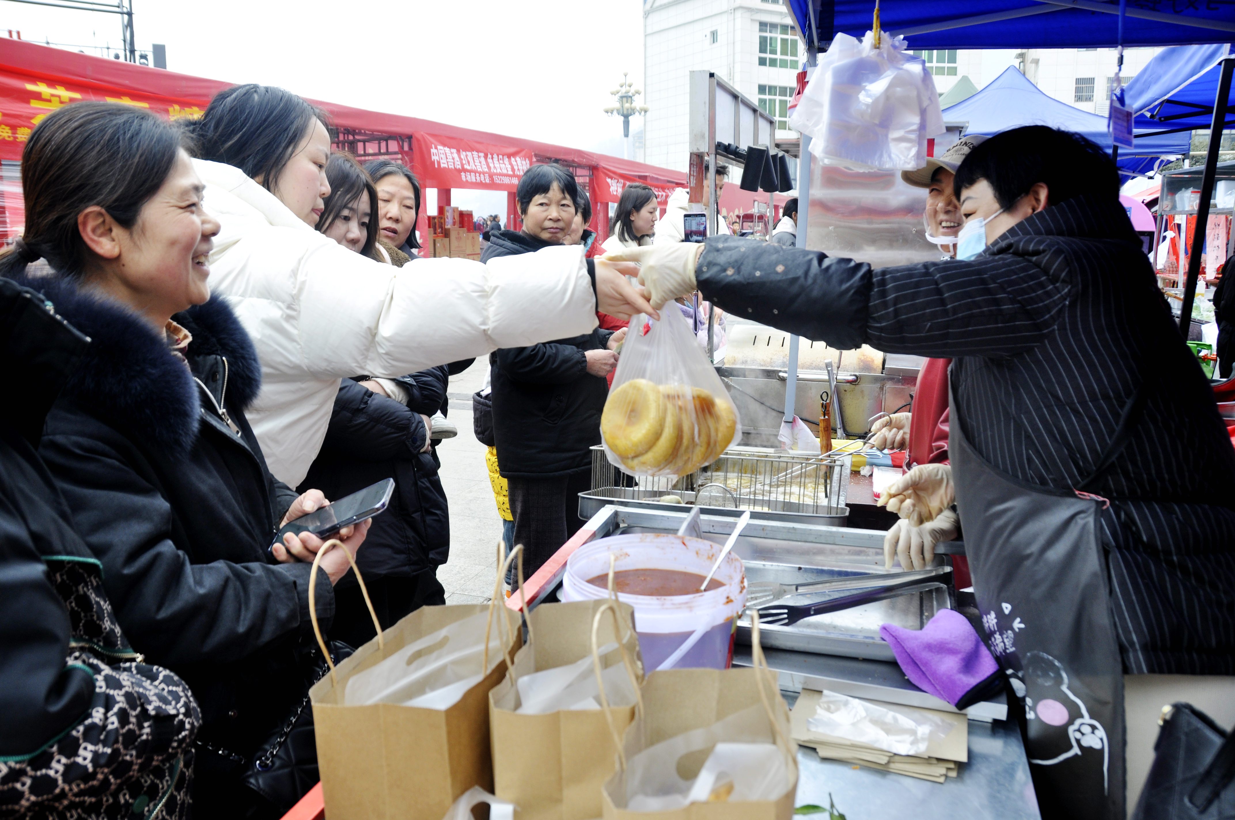 節(jié)日里的紫陽縣城一派繁榮祥和,圖為市民在頗有名氣的煥古高老二的油糍攤前排隊購買。彭召伍 攝