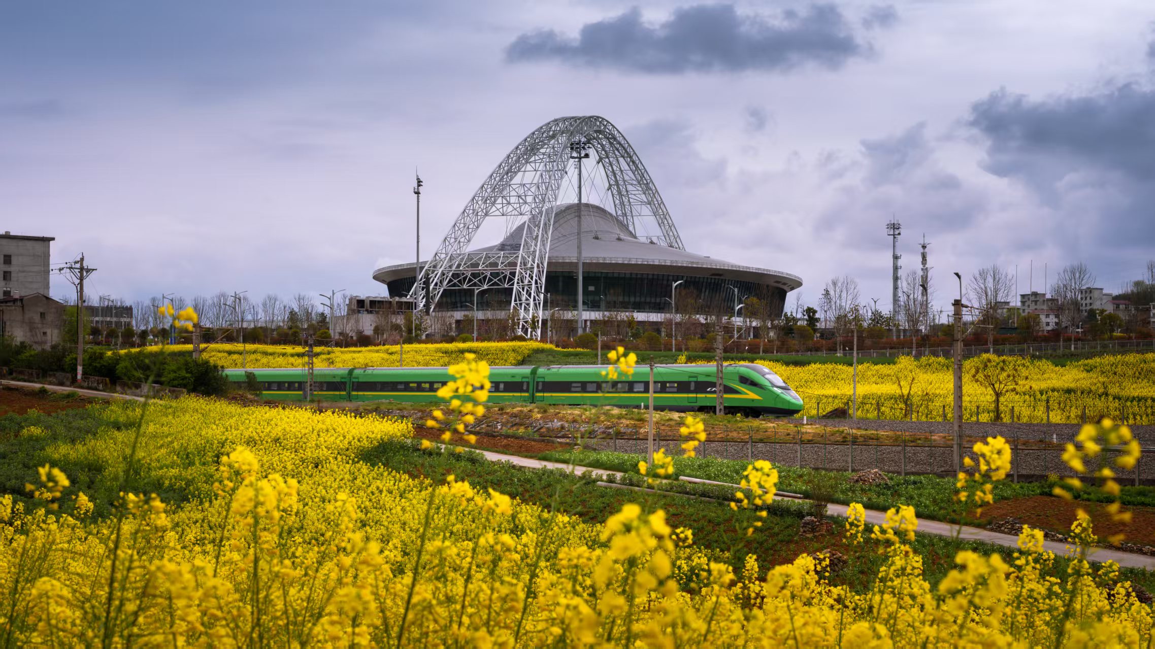 3月16日,安康市體育館前,金黃的油菜花海與飛馳的復(fù)興號(hào)列車(chē)相映成趣,盡顯春日生機(jī)。王坤侖 攝
