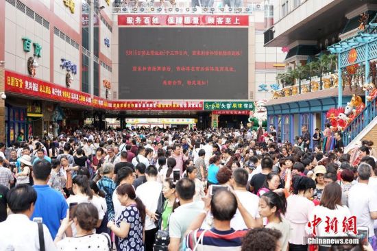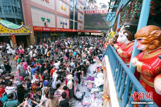 9月15日,商戶(hù)在北京天意商城甩賣(mài)商品,吸引大批顧客搶購(gòu)。天意商城是北京規(guī)模最大的小商品批發(fā)兼零售市場(chǎng),為疏解北京非首都功能,天意商城將于9月16日關(guān)門(mén)停業(yè)。中新社記者 盛佳鵬 攝