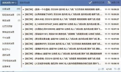“一開始我還跟他們講,你們就不要問了,直接發(fā)朋友圈吧!”黃平說,“后來實在回復(fù)不過來,只好設(shè)置了自動回復(fù),‘雙11’大促期間,掌柜已忙瘋!本店所有出售飛機(jī)都是真機(jī),歡迎大家提交訂單轉(zhuǎn)發(fā)朋友圈!”