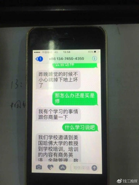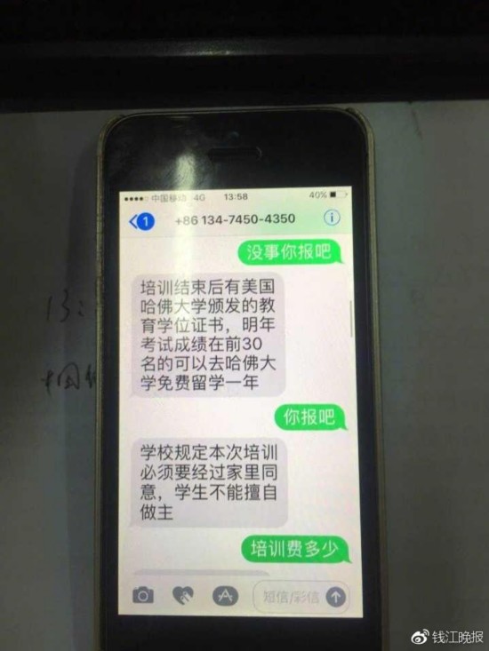 “爸,我是小麗。上午洗衣服手機掉水里開不了機,現(xiàn)在在上課,借了同學手機,跟你說件十萬火急的事。我們學校邀請了美國哈佛大學的資深教授來校面授培訓,名額有限。一堂課46800,你看我去不去呀?”