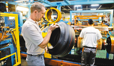 | 經(jīng)過5年溫和復(fù)蘇,歐洲經(jīng)濟(jì)增長(zhǎng)開始提速,2017年歐盟所有成員國10年來首次共同出現(xiàn)經(jīng)濟(jì)正增長(zhǎng)。圖為在法國普利司通輪胎廠,員工正在對(duì)輪胎進(jìn)行檢查。 |