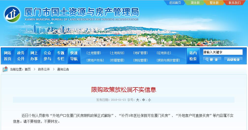 人民網(wǎng)北京1月24日電 據(jù)福建省廈門市國土資源與房產(chǎn)管理局官方網(wǎng)站消息,近日個別人員散布“外地戶口在廈門買房限購政策正式解除”、“補(bǔ)齊3年醫(yī)社保就可在廈門買房”、“外地客戶可直接買房”等內(nèi)容屬不實信息。ZmY安康新聞網(wǎng)