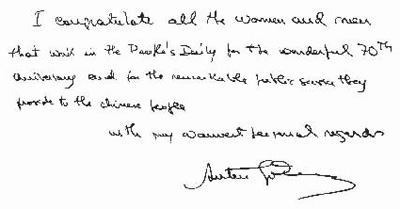 6月15日,人民日報將迎來創(chuàng)刊70周年紀念。當(dāng)?shù)孟と嗣袢請、人民網(wǎng)、人民日報“兩微兩端”等全媒體平臺超過7億的受眾,將通過文字和視頻分享他的見解時,古特雷斯非常開心,“這是我所見過的最大平臺了”。他欣然為人民日報題詞:“謹向人民日報創(chuàng)刊70周年致以最熱忱的祝賀。感謝貴報全體員工為中國人民提供的卓越服務(wù)。”(如圖二)