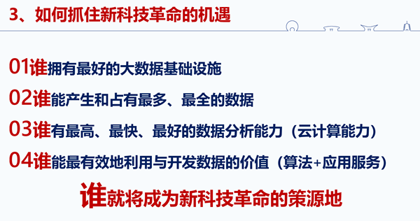 這一次新的科技革命,誰成為它的策源地,誰就會成為科技強(qiáng)國,這個(gè)也是十九大習(xí)近平總書記給我們提出的要求,到2050年中國要成為科技強(qiáng)國。要想成為科技策源地主要的競爭將會在四個(gè)層面展開:第一,誰擁有最好的大數(shù)據(jù)基礎(chǔ)設(shè)施;第二,誰能產(chǎn)生和占有最多、最全的數(shù)據(jù);第三,誰有最高、最快、最好的數(shù)據(jù)分析能力;第四,誰能最有效地利用與開發(fā)數(shù)據(jù)的價(jià)值,假如在這四個(gè)層面我們?nèi)梢灶I(lǐng)先世界,我們就是新的科技革命的策源地。