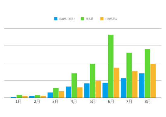 數(shù)據(jù)顯示,相較于1月,8月份凈水器在全國零售云店的銷量增長1390%,洗碗機增長1300%,掃地機器人增長573%,吸塵器增長490%,單反相機增長400%。