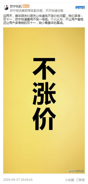面對快遞公司的紛紛漲價(jià),不少剁手黨們擔(dān)心,最后的成本都會(huì)出在自己身上。針對這一熱點(diǎn)話題,9月27日,蘇寧物流常務(wù)副總裁姚凱通過微頭條發(fā)聲,承諾這個(gè)雙十一,蘇寧快遞費(fèi)用不漲一毛錢!他認(rèn)為,不為用戶省錢還讓用戶多掏錢的雙十一,缺少最基本的真誠。