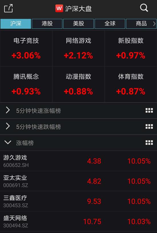 在消息發(fā)出后,游戲板塊集體爆發(fā)。從A股方面來看,截至周五(11月21日)收盤,在大盤整體低迷下跌0.79%的背景下,Wind電子競技指數(shù)和網(wǎng)絡(luò)游戲指數(shù)兩大概念板塊逆勢上攻,截至收盤分別上漲3.06%與2.12%,其中,游久游戲、盛天網(wǎng)絡(luò)、游族網(wǎng)絡(luò)、中青寶等漲停,完美世界上漲超6%,昆侖萬維上漲近3%。