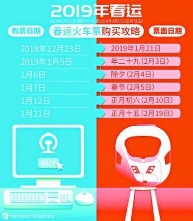 2019年鐵路春運從1月21日起至3月1日止,共40天,節(jié)前15天,節(jié)后25天。全國鐵路預計發(fā)送旅客41330萬人次,同比增加3176萬人次,增長8.3%,日均發(fā)送1033萬人次,再創(chuàng)歷年春運新高。鐵路春運火車票互聯(lián)網(wǎng)和電話訂票提前30天發(fā)售,2018年12月23日,可以購買春運第一天(2019年1月21日)的火車票,2019年1月6日可訂除夕當天車票。