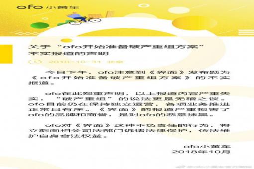 ofo開始準備破產(chǎn)重組方案?,官方回應(yīng):無稽之談