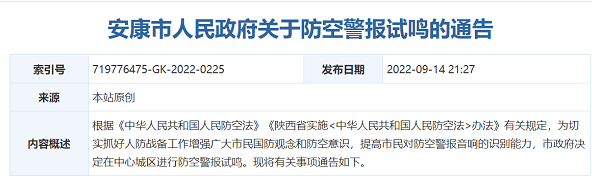 為貫徹落實《中華人民共和國人民防空法》,全面提高我市防空警報快速反應和廣大群眾對警報音響識別能力,切實增強人民群眾的國防意識和對重大自然災害的防范意識,安康市政府決定,2022年9月18日(星期日)上午9時05分至9時35分在全市試鳴防空警報。請廣大市民保持正常的工作和生活秩序。cCy安康新聞網(wǎng)