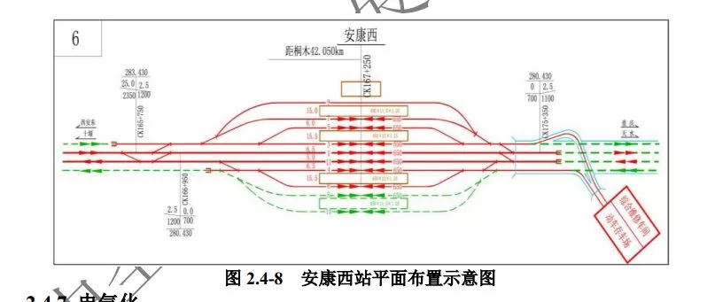車站初始規(guī)3臺(tái)8線布置,遠(yuǎn)期隨天水一十堰鐵路引入預(yù)留1臺(tái)2線(PS:另一條高鐵過境安康,美),總規(guī)模4臺(tái)10線。到發(fā)線有效長(zhǎng)650m,設(shè)島式站臺(tái)(450×12×1.25m)4座,設(shè)旅客進(jìn)出站地道2座(寬12m)。
