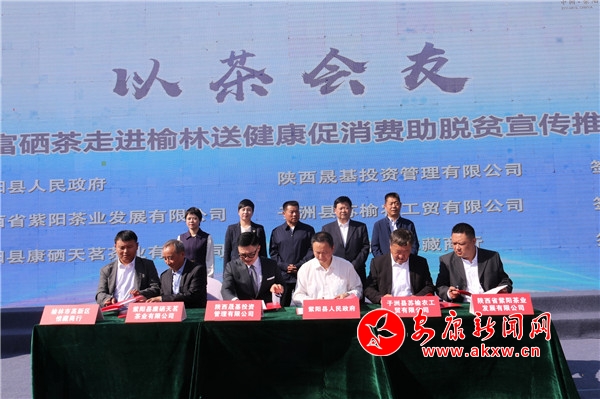 活動儀式上,國家一級茶葉審評技師、陜西省茶人聯(lián)誼會會長韓星海對安康紫陽富硒茶作專業(yè)點(diǎn)評,紫陽縣有關(guān)部門負(fù)責(zé)人作紫陽招商推介、紫陽富硒茶推介、紫陽旅游推介;顒舆M(jìn)行了簽約、紫陽富硒茶專家點(diǎn)評和“紫陽富硒特產(chǎn)營銷中心”授牌儀式。紫陽縣人民政府與陜西晟基投資管理有限公司簽訂富硒礦泉水綜合開發(fā)項(xiàng)目;陜西省紫陽茶業(yè)發(fā)展有限公司與子洲縣蘇榆農(nóng)工貿(mào)有限公司簽訂“紫陽富硒茶、子州”養(yǎng)生茶項(xiàng)目合作開發(fā)協(xié)議;紫陽縣康硒天茗茶業(yè)有限公司與榆林市高新區(qū)惟藏商行簽訂紫陽富硒茶購銷協(xié)議;紫陽縣供銷聯(lián)社與陜西煤山煤海有限公司簽訂共建“榆林市紫陽富硒特產(chǎn)營銷中心”協(xié)議,紫陽縣供銷聯(lián)社與榆陽區(qū)供銷聯(lián)社簽訂“地方特產(chǎn)供銷互促合作協(xié)議”。