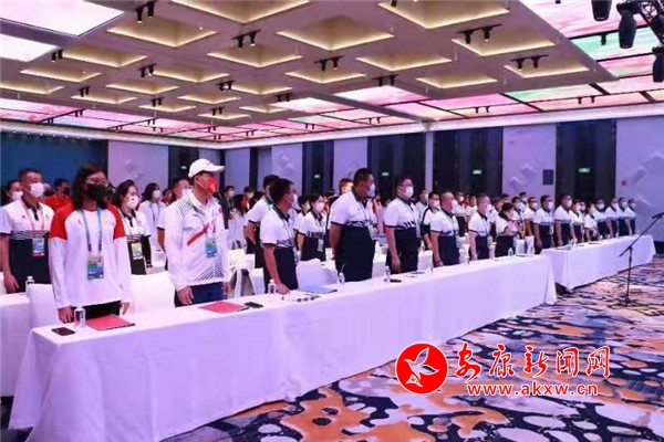 會(huì)議在莊嚴(yán)的國歌聲中開始,全體運(yùn)動(dòng)員、教練員、技術(shù)官員身著隊(duì)服,肅立齊唱國歌。