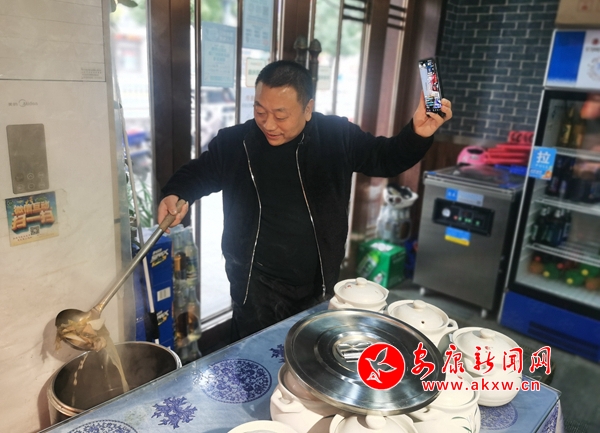 白天店內(nèi)忙碌的時候,“70后”的梁存杰會舉著手機,記錄下食客排隊購買自家鹵豬蹄的畫面。到了傍晚,當?shù)陜?nèi)的客流達到頂峰時,后廚里忙碌的場景又成了他的視頻素材。他會在閑暇之余將這些拍攝的素材進行簡單剪輯后發(fā)布在自己的短視頻賬號上和朋友圈里,他的目的很簡單:“就是想讓大家都知道天源飯莊,在短視頻上介紹新菜,包括客戶的評價,都是為了吸引更多的顧客,做生意嘛,就是圖一個生意興。”