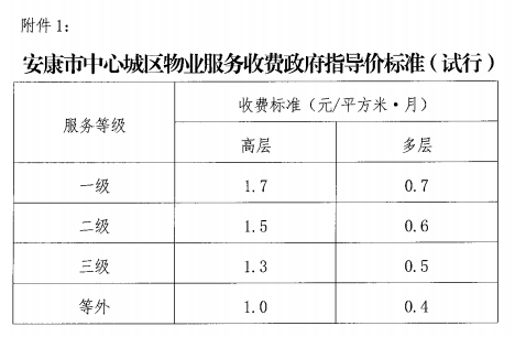 附:1、《安康市中心城區(qū)物業(yè)服務(wù)收費政府指導(dǎo)價標(biāo)準(zhǔn)》(試行);
